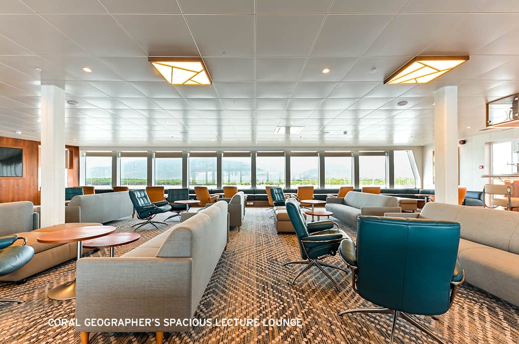 - A natural light-filled lecture lounge equipped with modern technology for daily presentations and briefings by expedition experts and guest lecturers